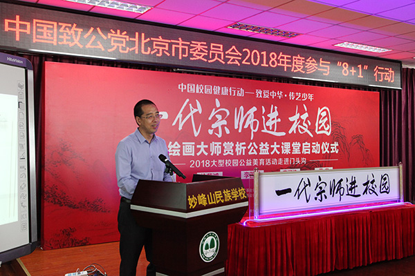 6月12日上午,致公党北京市委与中国关心下一代健康体育基金会在门头沟区妙峰山民族中学,联合举办致爱中华•传艺少年 “一代宗师”进校园——中国绘画大师赏析公益大课堂系列活动启动仪式,市委专职副主委刘学增出席活动并讲话。