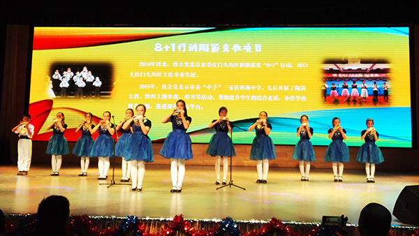 1月20日,市委组织三家店铁中“北京致公爱心陶笛乐团”参加了2018年首都陶笛乐友新春音乐会的演出。乐团的同学们表演了陶笛二重奏节目,与来自北京市各区十余所学校的老师同学一起交流学习陶笛表演。