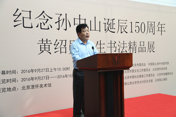 2016年9月27日上午,“纪念孙中山诞辰150周年——黄绍勋先生书法精品展”在北京澄怀美术馆开幕。致公党北京市委副主委、北京市房山区副区长卢国懿出席开幕式并致辞,致公党中央原副主席王宋大、致公党中央原秘书长邱国义、致公党中央宣传部副部长范承玲等参加了活动。 卢国懿副主委在开幕式上致辞 领导嘉宾参观作品 本次书法展由致公党北京市委、致公党中央宣传部、中国致公画院主办,致公党北京市委文化工作委员会、致公党北京市委社会服务工作委员会、北京致公书画院、北京澄怀美术馆承办,北京市收藏家协会、中国致公党北京市大兴区总支部等单位参与协办,是今年致公党北京市委纪念孙中山诞辰150周年系列活动的重要活动之一。展出作品为致公党老党员黄绍勋先生以孙中山先生名言警句为主题专门创作的一批书法精品,寄托和弘扬了孙中山先生的爱国思想和革命精神。 |