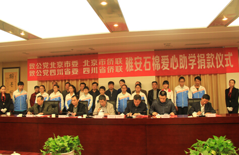 2013年4月,致公党北京市委与北京市侨联联合举行了向四川雅安地震灾区捐款仪式,经过一年多的运作和筹备,市委和市侨联决定设立“北京致•侨爱心助学基金”,将善款用于帮扶雅安市石棉县。 |