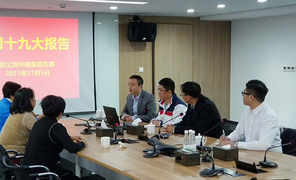 2017年11月5日,致公党东城区委中信集团支部召开会议,学习贯彻中国共产党第十九次全国代表大会精神。支部主委葛乐主持会议并带领支部党员学习了十九大报告。 支部党员一致表示,中国特色社会主义进入新时代,为广大民主党派施展才能,发挥作用创造了更大舞台,提出了更高要求。要把习近平新时代中国特色社会主义思想这一行动指南深入贯彻到工作中,在做好本职工作的同时,全面提高参政议政能力,为创新金融服务实体献计出力。