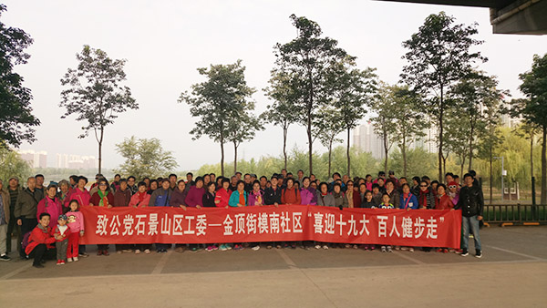 2017年10月15日,致公党石景山区工委组织石景山区金顶街模南社区120名居民在莲石湖开展了全程 9公里的“喜迎十九大 百人健步走”大型活动。 此次活动是区工委“送健康进社区”系列活动的一部分。据了解,由于模南社区的地理位置和条件等原因,百姓集体出行、健身的活动有限。这次健步走活动为居民提供了难得的结伴锻炼机会,受到社区居民的一致好评。