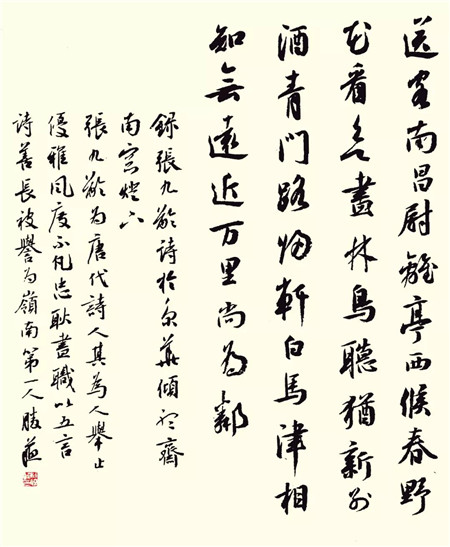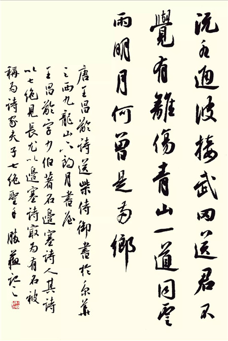 唐 • 王昌龄《送柴侍御》 沅水通波接武冈,送君不觉有离伤。 青山一道同云雨,明月何曾是两乡。 (作者:杜胜苏,致公党北京市门头沟区支部党员,中国书协会员) |