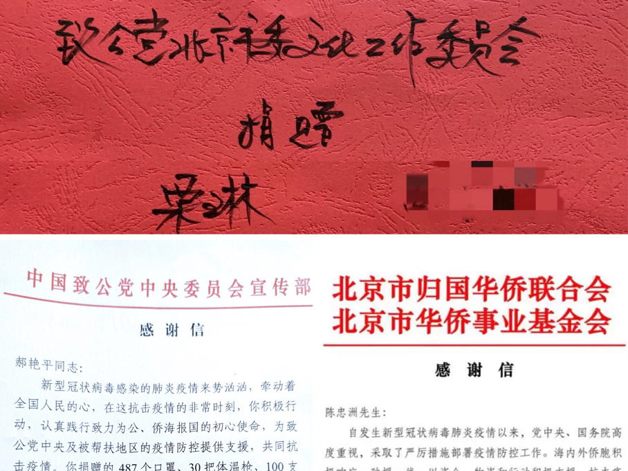 捐赠最多的文化委副主任陈忠洲表示,我虽然不能奔赴一线,但我必须尽到自己的一份责任与力量!他通过海外、港澳台等渠道,多次向武汉等地的医院、红十字会、慈善总会及致公中央、市侨联、怀柔区等地大量的捐款捐物,总价值人民币五百余万元! 委员郝艳平分别向致公中央、市区委、门头沟区、医院以及军烈属、伤残军人、低保户家庭、残疾人士、环卫工人等捐赠了各类医疗防护用品,并冒着被传染的危险、甚至冒着大雪将捐赠物品及时送到受赠者手中,总价值人民币三十余万元。她说,践行致力为公的初心和使命,责无旁贷。 副主任胡永芳、翟旭东积极带头捐款,在手术室外焦急等候孩子手术结果的委员陈妤、旅居国外的委员梁宾宾、患病的委员林一叶、热心文化委工作、关注疫情的赵丽娟、王华、贾绍昌、叶曲、王琪、黄严、吴蕾、边静、陈梅兰、王庆忠、栾越、朱毅飞、李建新、蔡学江、宁学睿、胡孝群等几十名委员,都是在得知捐赠提议后的第一时间即捐出了一份爱心......
