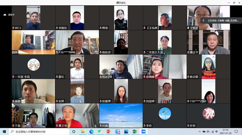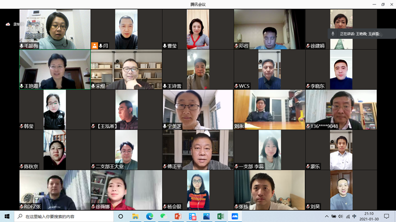 2021年1月30日,根据当前疫情防控工作要求,丰台区工委以网络视频方式召开2020年度总结表彰会。会议由工委主委王艳霞主持,副主委王诗雪传达了致公党北京市委九届十次全会精神,副主委曹莹总结了区工委2020年度工作,副主委陈妍宣布了区工委表彰决定,秘书长王峻宣读了致各支部卸任支委们的感谢信并部署节前重点工作,各支部主委汇报了2021年工作计划。最后王艳霞做了总结讲话。 会议认为,2020年,在致公党北京市委和中共丰台区委的坚强领导下,区工委带领各支部和全区党员,努力克服疫情带来的严重影响,深入开展“不忘合作初心,继续携手前进”主题教育,政治思想基础得到巩固;突出班子带好队伍,组织建设水平得到提升;抓住重点统筹谋划,参政议政取得丰硕成果;保持传统发挥特色,助力抗疫侨海报国。在全体党员的共同努力下,圆满完成了各项工作。 会议强调,2021年,是中国共产党成立100周年,也是“十四五”的开局之年。我们要不断加强学习,切实提升政治站位;抓好人才培养,做好换届政治交接;加大培训力度,提高参政议政能力;注重搞好结合,创新推进社会服务工作;发挥党派特色,扎实做好海外联络工作。 王艳霞主委在总结讲话中指出,2020年,区工委坚持党派履职和疫情防控“两手抓”,成效明显,成绩突出。2021年疫情形势依然严峻,工作任务十分艰巨。新的一年里,在习近平新时代中国特色社会主义思想指引下,全区党员要积极参与并做好疫情防控工作,锐意进取,开拓创新,努力增强政治意识、奉献意识、团结意识、服务意识,牢记党派成员身份,认真履行参政党职能,为丰台区经济社会发展做出新的贡献,推动区工委建设再上新台阶。 区工委委员、各支部本届和上一届委员、受表彰的党员共30余人参加会议。