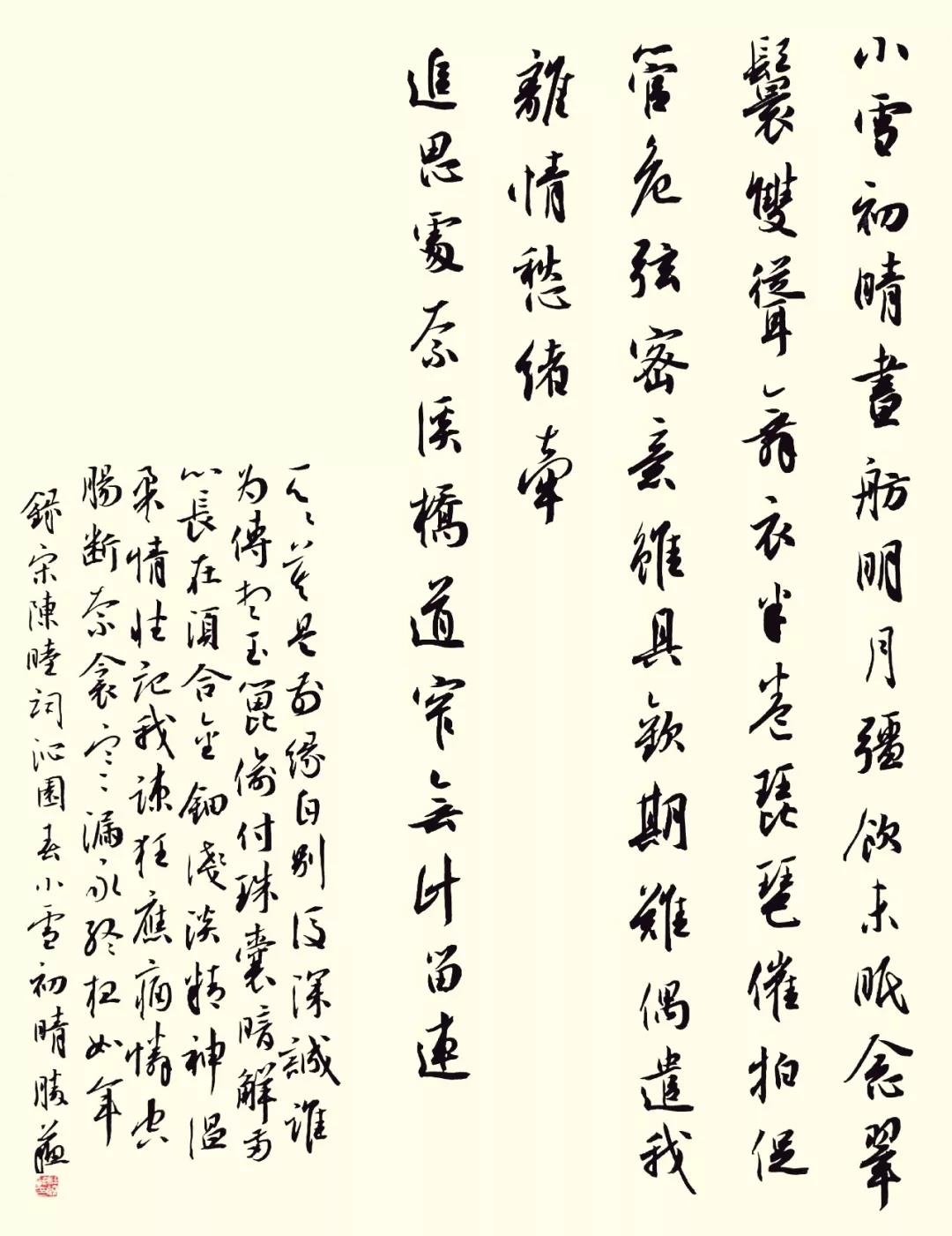 《沁园春·小雪初晴》 宋·陈睦 小雪初晴,画舫明月,强饮未眠。 念翠鬟(huan)双耸,舞衣半卷,琵琶催拍,促管危弦。 密意虽具,欢期难偶,遣我离情愁绪牵。 追思处,奈溪桥道窄,无计留连。 天天。莫是前缘。自别後、深诚谁为传。 想玉篦偷付,珠囊暗解,两心长在,须合金钿。 浅淡精神,温柔情性,记我疏狂应痛怜。 空肠断,奈衾(qin)寒漏永,终夜如年。